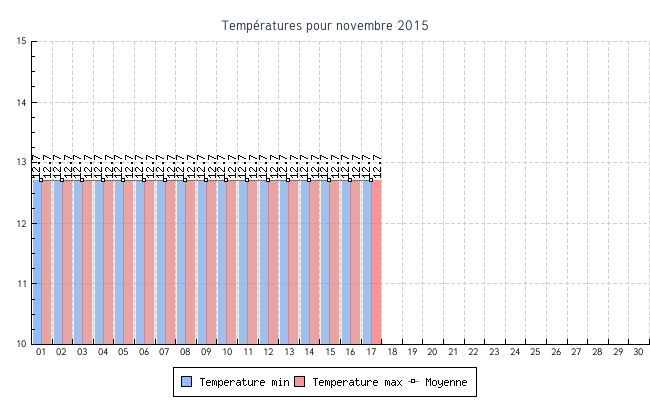 | 15 | 12.7 °C | 12.7 °C | 12.7 °C | 0.0 km/h (0.0 km/h) | NNE |